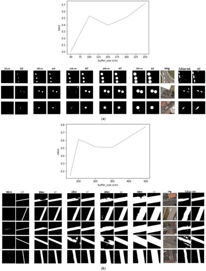 We trained a standard U-Net segmentation model [31] with masks of different buffer distances for example vehicle and road datasets, and compared the results using the mIoU metric to account for model learning of the geometric aspect of geographic objects [17]. Figure 10 exhibits the mIoU results obtained with the U-Net. For both datasets, a buffer distance of 1 m produces the second-best mIoU results after the biggest buffer distance used. However, the road structure and vehicle position are easier to extract from a thinner mask, and furthermore, thinner masks have a smaller number of misclassified pixels of other classes such as buildings and trees, which can also cause a problem if using multiclass masks for segmentation.