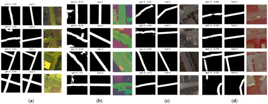 Different sizes for tessellations can be used, for instance, 256 × 256, 512 × 512, and 1024 × 1024 pixels. The images and corresponding masks are then paired into single images (img, msk) with sizes of 512 × 256, 1024 × 512, and 2048 × 1024 pixels, respectively. Every (img, msk) pair is checked to pass an imbalance threshold chosen by the user, for example, 1%, 5%, or 10%. Vehicles and roads pixels are imbalanced with respect to the background. Figure 9 shows an example of vehicle and road datasets produced with the pipeline. Appendix A contains the link to download these datasets.