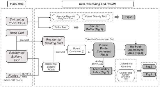 We used Python to scrape data from the Baidu Map API (Application Programming Interface). We obtained 162 sets of data, matching the number of the pools. Each pool’s data set includes one swimming pool POI (Point of Interests), the residential building POIs within 3 km of the pool, and the navigation route data (including walking and cycling routes) between this pool and each of those residential buildings (Table 1). In addition, we introduced two sets of geometric data to support the analysis, which were called ‘Base Grid’ and ‘Residential Building Grid.’ The Base Grid is an auxiliary analysis dataset with a side length of 30 m that we created using the Fishnet Tool in ArcGIS. It is big enough to completely cover the main city area. The Residential Building Grid was obtained by intersecting all the residential building POIs in the study area with the Base Grid. We choose 30 m as the side length to match the population raster data [36]. The details of the data processing are as follows (see the flowchart in Figure 1):