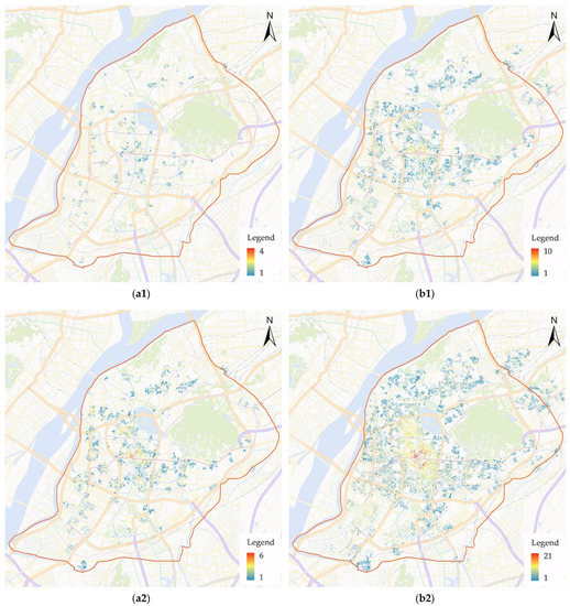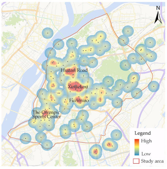 We then performed the kernel density analysis to map the overall distribution of the pools. After many trials and comparisons, the search radius was set to 1000 m (which is approximately a 15-min walk). As Figure 2 shows, there is a trend of density in the central area and sparseness in the peripheral areas. There is also a multi-core distribution. The main center is located at Xinjiekou, followed by Hunan Road, Fuzimiao, and Olympic Sports Center. We found that the first three of those are all located in commercial centers with convenient transportation, probably because pool owners want to rely on large flows of people to increase turnover.
