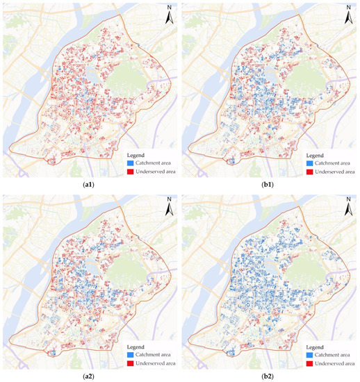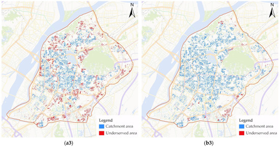 The overall route catchment and underserved area (a1–a3) walking; (b1–b3) cycling and (a1,b1) 5 min; (a2,b2) 10 min; (a3,b3) 15 min.