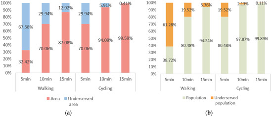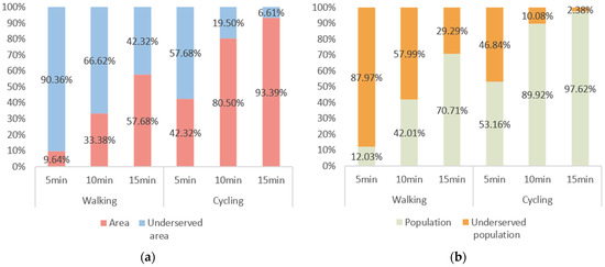 Figure 3 shows the overall route catchment and the accessibility index for walking and cycling with three different time costs, which are 5 min, 10 min, and 15 min. Figure 4 shows the percentages of each catchment area with different travel modes to the Residential Building Grid; area and population were both calculated. We found that 53.16% of the residents can access a pool within 5 min by cycling, and the number is only 12.03% when they travel on foot. This poor situation is largely improved if the time cost is 10 min. About 89.92% of the residents can access a pool by cycling, and 42.01% when traveling on foot. When the time cost is 15 min, these figures are up to 97.62% and 70.71%. In addition, we noticed that the underserved areas are more likely to be in less commercially developed areas at the edges of the main city, or in areas with obvious ground obstacles, such as the foot of the mountains and the riverside.