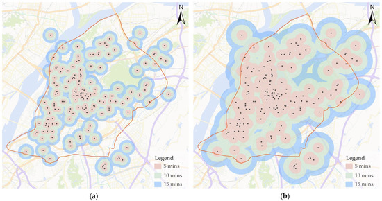 Figure 5 shows the catchment area which is generated using the method of the circular buffer. To unify our measurement standards, we calculated the percentage of the grid squares covered by the circular buffer to the Residential Building Grid and its corresponding populations (Figure 6). The results show that the Residential Building Grid is well-covered by the circular buffer. Even when traveling on foot, there are still 38.71% of residents that can reach a pool within 5 min. If traveling by bike for 15 min, this figure is up to 99.89%. By comparing Figure 4 and Figure 6, it can be seen that the circular buffer’s area and population are 1–3 times as large as the overall route catchments in this study. The shorter the travel time, the larger the multiple. This means that the overall circular buffer at the city level significantly mismatches the real catchment areas of the facilities, as the route catchment is very close to the real travel situation.