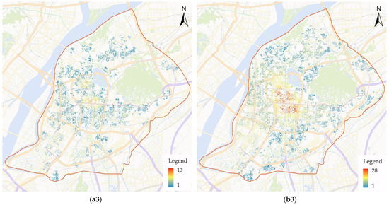 The accessibility index (a1–a3) walking; (b1–b3) cycling and (a1,b1) 5 min; (a2,b2) 10 min; (a3,b3) 15 min.