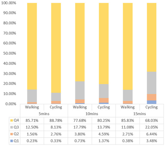 We calculated and mapped the accessibility index (Figure 7) using the method described above. The maximum value of the walking accessibility indexes are 4 (5 min), 6 (10 min), and 13 (15 min), and the corresponding cycling accessibility indexes are 10 (5 min), 21 (10 min), and 28 (15 min). All of them are located near Xinjiekou. This is similar to the result of the kernel density analysis above. We also found that the accessibility indexes showed a sharply decreasing trend outward, with Xinjiekou as the main center. We quartered the accessibility indexes by their value and calculated the percentages of each part (Figure 8). For all situations, the top quartile, with larger values of the accessibility index, accounts for a very small percentage. Correspondingly, the bottom quartile accounts for a very large percentage. This reveals that the spatial disparity in pool accessibility in Nanjing is significant.