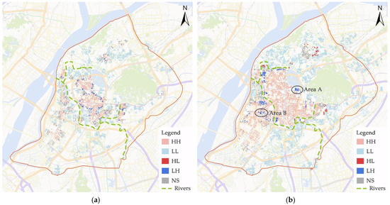 Results of the cluster and outlier analysis for (a) walking; (b) cycling. Areas A and B are two places with LH outliers but no significant ground obstacles around them, more discussion can be seen in Section 4.1.