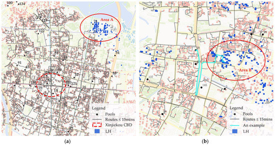 We checked the lists of pools accessible from these outliers and compared them with their surrounding elements, then summarized two factors in the inner differences of the accessibility index. First, the differences are largely influenced by the spatial distribution and density of the swimming pools. For example, the accessibility index of the outliers in area A (Figure 9b) is only around 5–6, but the high-value elements surrounding them are generally around 10. We compared the pool lists and the original navigation route data associated with the outliers and the high-value elements, and we found that area A was located just outside the boundary of the 15-min cycling catchment of Xinjiekou—the most densely distributed area of pools. Thus, the accessibility index sharply decreased in area A, resulting in outliers (see Figure 10a for more details). Most of the outliers on the boundary between high- and low-value areas in Figure 9a also occur for this reason. Second, the accessibility index is easily influenced by ground obstacles such as rivers, mountains, gated parks and schools, and elevated roads that cannot be crossed directly. These obstacles extend travel distances and reduce traffic efficiency, leading to a decrease in the accessibility index. For example, due to the elevated road on the west side of area B (Figure 9b), the residents cannot cross the street directly, resulting in a sharply reduced accessibility index (see Figure 10b for more details). We checked the other LH outliers in Figure 9b and found that most of them had the same cause, though the actual ground obstacles were moats, lakes, old city walls, gated parks, and so on.