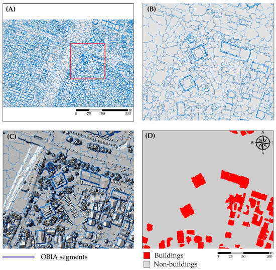 - Zarro, C.; Ullo, S.; Meoli, G.; Focareta, M. Semi-automatic classification of building from low-density Lidar data and worldview-2 images through OBIA technique. In Proceedings of the IGARSS 2020 IEEE International Geoscience and Remote Sensing Symposium, Waikoloa, HI, USA, 26 September–2 October 2020; IEEE: New York, NY, USA, 2020. [Google Scholar]