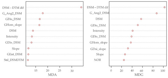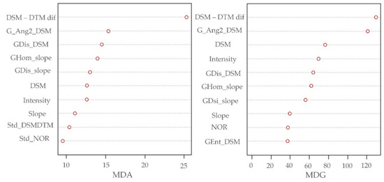 | Layers | Mean values of; intensity, slope, DSM, DSM–DTM difference, number of returns. Standard deviation of; intensity, slope, DSM, DSM–DTM difference, number of return. |