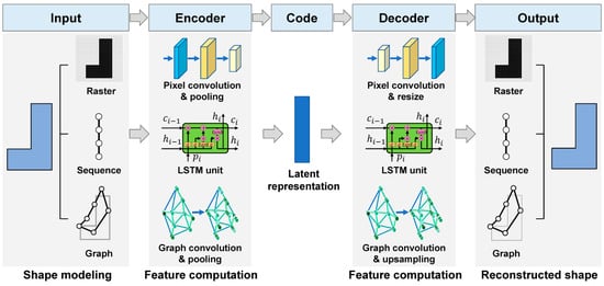 The feature computations used in the encoder and decoder differ for different shape modeling methods. In this study, raster-based, sequence-based, and graph-based methods for modeling two-dimensional shapes were considered. Correspondingly, three deep encoder–decoders were built to extract the hidden encoding features for representing the shapes, as illustrated in Figure 1. The following sections detail the three encoder–decoders.