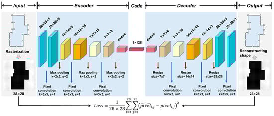 To obtain a raster-based image for a shape, the differences between the maximum and minimum values on the horizontal and vertical axes were calculated, and the larger value was taken as the edge length to obtain a square with the centroid of the shape considered as the center. This square was appropriately expanded outward (e.g., 10%) to ensure the integrity of the shape. A suitable grid was then established to rasterize the square. The size of the grid cells directly affects the clarity of the data content representation. If the cell size is too large, a serious mosaic phenomenon occurs, which makes it difficult to present the outline details. If the cell size is too small, the training efficiency of the model is affected. By considering the clarity of the images and the complexity of the model comprehensively, the grid size was set at 28 × 28 pixels in this study. Finally, the grid cell is binarized. That is, when a cell falls within the shape with more than half of the area, the cell is set to black; otherwise, it is white.
