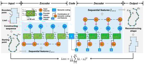 Because the distance between two adjacent nodes on a shape boundary is not identical, the processing unit is not stationary. To address this issue, the boundary was divided into a series of consecutive linear units of equal lengths, termed lixels [], and the midpoints of the lixels were considered as the sequence nodes. For each sequence node, the horizontal and vertical differences between the two ends of the associated lixel were used as the two features to describe it. Finally, a vector, , containing  sequence nodes with two-dimensional features, was constructed to serve as the input for the shape encoding model. Referring the parameter settings used in the literature [],  was set to 64.