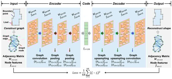 A graph-based encoder–decoder (GraphNet) was built to process the constructed graph. The overall architecture is illustrated in Figure 4. The encoder included one graph convolution layer with 32 feature maps (i.e., the number of kernels), and the polynomial order of each kernel was set to 3. It also contained two graph pooling layers. After pooling, the number of nodes and feature dimensions were set to 32 and 24 and 16 and 8, respectively. The output of the last layer in the encoder was expanded into a 128-dimensional feature vector, that is, the shape encoding. Correspondingly, there were two graph upsampling layers and one graph convolutional layer in the decoder to restore the size of the graph to be the same as the input.