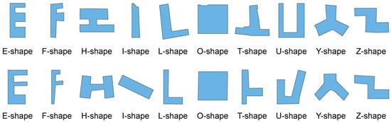 An open building shape dataset was used in the experiments []. As a typical artificial geographical feature, buildings are often represented in maps as two-dimensional shapes, with obvious visual features such as right-angle turns and symmetry. In this dataset, 10 categories of buildings were distinguished according to the forms of English letters, as shown in Figure 5. Each category contained 501 buildings, with a total of 5010 shapes.
