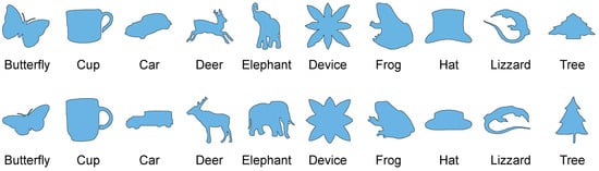 Because the building shapes used in this study were relatively simple, we tested the different shape encoding methods on a more complex dataset, the MPEG-7 dataset [], to verify and compare the performance further. This database is characterized by a wide variety of categories. It includes a total of 70 shape categories covering animals, plants, and supplies. Each category includes 20 shapes, for a total of 1400 shapes. Figure 7 shows some examples from the dataset.