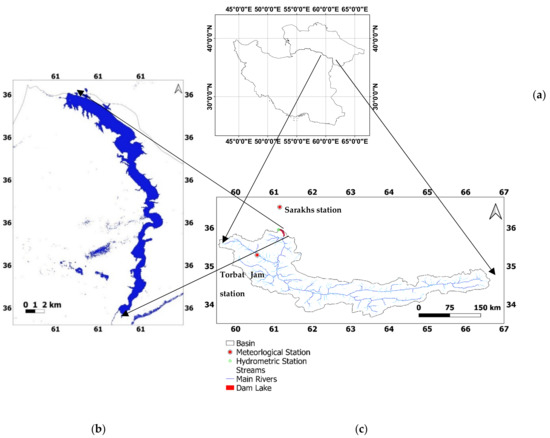 Location of Doosti Dam’s river basin drainage system. (a) Shows Iran (left) and Turkmenistan (right), (b) shows the Doosti reservoir from NDWI Landsat datasets, (c) shows Doosti Dam’s river basin.