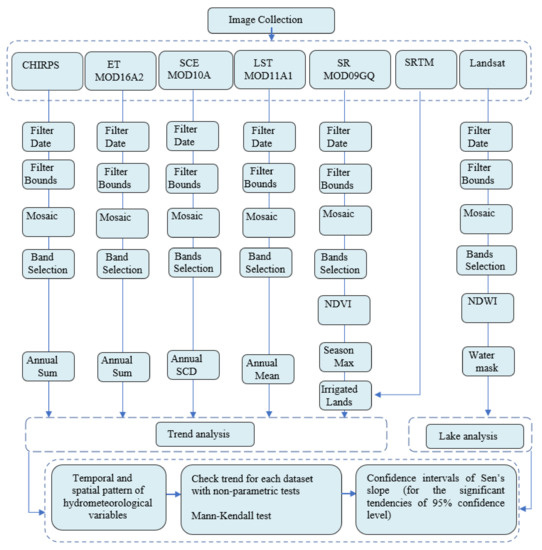 We used a rich time series of remote sensing data to gather further details about the scope of this study. The remote sensing data used in this study included the Climate Hazards Group InfraRed Precipitation With Station (CHIRPS) dataset (500 m spatial resolution), MODIS Terra Evapotranspiration (MOD16A2) (500 m spatial resolution), MODIS Terra snow cover MOD10A1 (500 m spatial resolution), MODIS LST MOD11A1 (1 Km spatial resolution), MODIS NDVI MOD09GQ (250 m), Landsat TM/ETM+/OLI (30 m spatial resolution), SRTM (NASA SRTM Digital Elevation 30 m) were obtained from the online dataset provided by GEE. A framework of this study is presented in Figure 2.