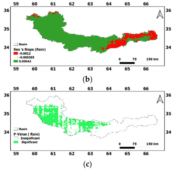 Figure 6 shows the spatial distribution of trends in the annual precipitation based on CHIRPS estimates for the period from 2004 to 2021. The spatial pattern of the MK test shows that precipitation increased in most regions of the Doosti Dam’s basin (Figure 6a), and from the statistical point of view, this trend is significant at a 95% level of confidence for annual precipitation. Figure 6b, shows an increasing trend in rainfall in the middle and west regions of the basin with a Sen’s slope calculation which varies from 0.00043 (upper limit) to −0.00012 (lower limit) (p-value < 0.05) for upward and downward trends for the significant tendencies at 95% confidence level, respectively. Moreover, a statistically significant increasing tendency was detectable across the center and downstream of the region (+0.00043). The p-value is less than alpha = 0.05, indicating that there was a trend in the time series. So, the results clearly demonstrate that in most parts of basin, especially center to downstream (p-value = 0.5), an upward trend with a 95% confidence level is observed; however, there was no significant trend in the upstream, as illustrated in Figure 6c. In Figure 6b, the Sen’s slope and MK test indicate that rainfall trends show climate change has occurred in the basin.