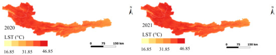 Among the TIR sensors, the LST products of MODIS aboard the Terra and Aqua platforms’ data have high quality, global coverage and accurate geolocation [42]. Daily MODIS LST products [43] are retrieved at 1 km pixels by the generalised split-window algorithm. The daily average land surface temperature was extracted from the MODIS [44].