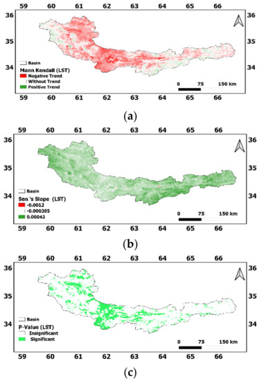 LST is an extremely important parameter that controls the exchange of longwave radiation and sensible heat flux between the Earth’s surface and the atmosphere. Therefore, trend analysis of LST is essential for the study of the hydroclimatology behaviour of basins. Generally, LST products are derived from thermal infrared (TIR) sensors (e.g., AVHRR, MODIS or METEOSAT) [41].
