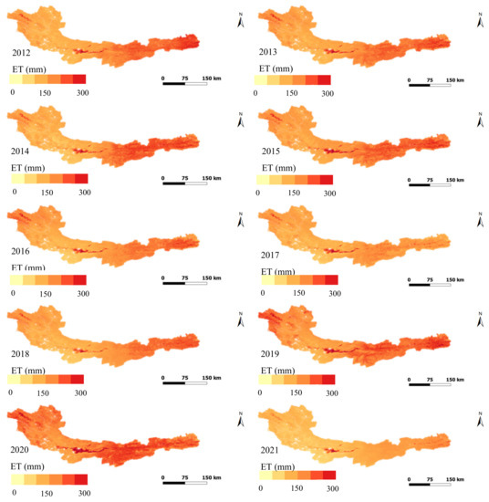 The spatial–temporal distribution of annual evapotranspiration (mm) from the MODIS product (MOD16A2) derived from GEE in the period of 2004–2021.