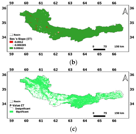 This figure reveals a rising trend in evapotranspiration in the regions of the basin with a Sen’s slope calculation which varies from +0.00043 (upper limit) to −0.0012 (lower limit) for upward and downward trends for the significant tendencies at a 95% confidence level, respectively. Moreover, a statistically significant increasing tendency is detectable across the region (+0.00043). Figure 10c shows that evapotranspiration rose in the whole basin as the p-value is less than alpha = 0.05 and with a 95% level of confidence which is significant. This figure also confirms a significant rise in the trend (p < 0.05) of evapotranspiration values from 2004 to 2021. The increasing trend in evapotranspiration during the years 2004–2021 is almost identical to the rainfall trend.