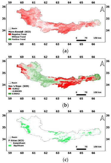 Figure 12b shows a decreasing trend for SCD in the western part of the basin with a Sen’s slope calculation of −0.0012 (lower limit) indicating a downward trend for the significant tendencies at a 95% confidence level.