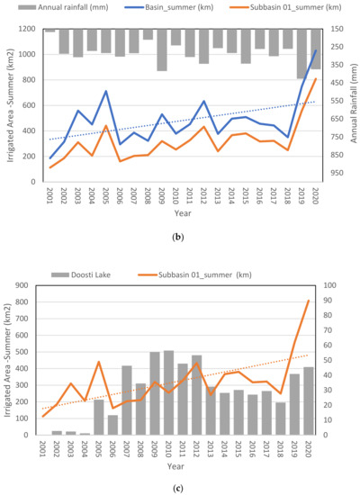- This study was focused on understanding how the irrigated cultivated lands responded to different hydroclimatic variables. Because it is a transboundary region, has diverse topography and climate change conditions, the monitoring of the irrigated lands was difficult. Elevation had a significant influence on the climate and the Doosti Dam, situated at a lower elevation, was employed to comprehend the long-term spatiotemporal variability of the irrigated areas and related climatic and hydrological causes. NDVI derived from MODIS indicated the strong correlation between the NDVI and precipitation in the winter.