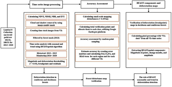 The applied methodology begins with the pre-processing of the Landsat 8 OLI satellite images through cloud masking and VI calculation, then producing the forest masks for the study sites, applying the BFASTMonitor steps, and lastly, performing the accuracy assessment. A detailed flowchart of the applied methodology is presented in Figure 2.
