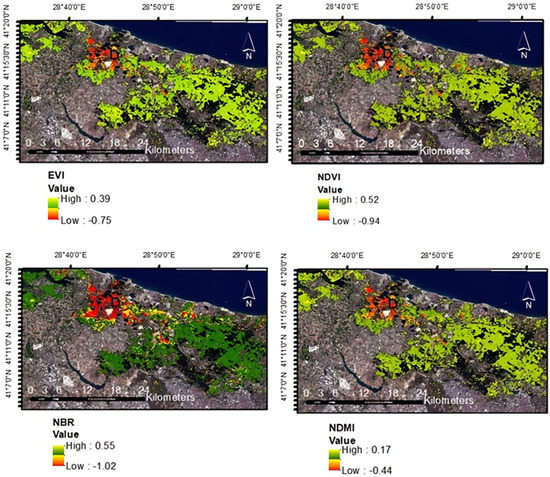In this study, the OA, UA, and PA metrics, which were calculated with respect to the labeled reference points, were used to demonstrate the accuracy of the BFASTMonitor method in the detection of changes over deciduous and coniferous forest types (Table 4). For the mixed deciduous forest, apart from massive deforestation due to the construction of the new airport in Istanbul, the OA of VIs tolerated from 79% for EVI to almost 85% for NDVI. Moreover, coniferous forest regions with smaller areas of disturbances indicated an OA at about 89% for NDVI and around 88% for others. In the confusion matrix, it is indicated that the amount of PA for the deforestation detection class over the deciduous forest varied between VIs, which was around 62% for EVI and NDVI, while NBR showed 63% of PA. Meanwhile, the coniferous forest site’s percentage of PA related to the deforestation detection class was 64% for NDVI, 66% for NBR, and roughly 60% for EVI and NDMI.