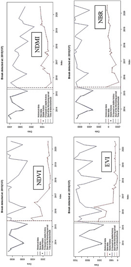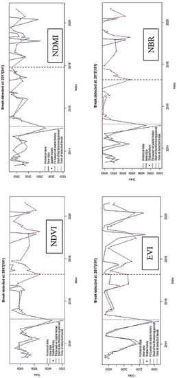 NDVI, NDMI, EVI, and NBR time series profiles using pixel-level analysis of the BFASTMonitor algorithm over study area A.