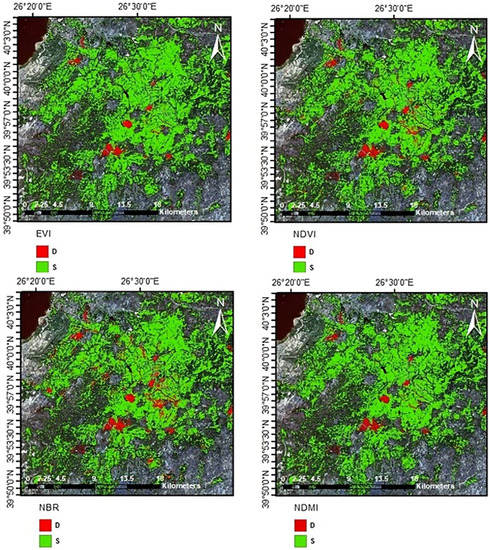 According to Table 3, the detected forest disturbance percentage in the mixed deciduous forest (site A) varied between 13% and 23% for different VIs. For the coniferous forest (site B), the variation of the detection was between 3% and 7.5%. The deforested areas for both study sites are represented in Figure 7 and Figure 8, respectively.