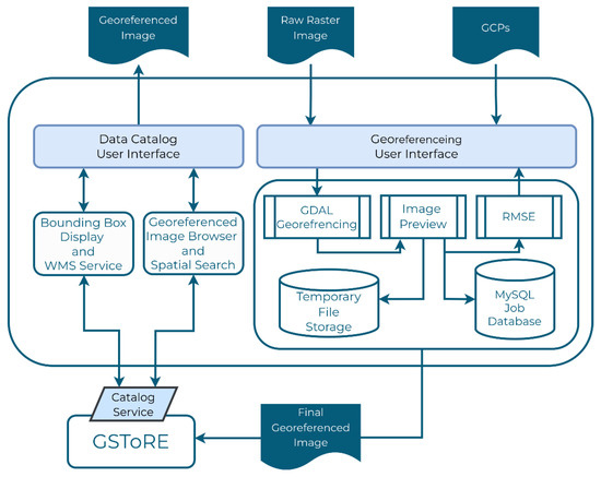 The architecture of the developed georeferencing web application. GCPs denote ground control points, GDAL denotes Geospatial Data Abstraction Library, RMSE denotes root-mean-squared error, and GSToRE denotes Geographic Storage, Transformation, and Retrieval Engine.