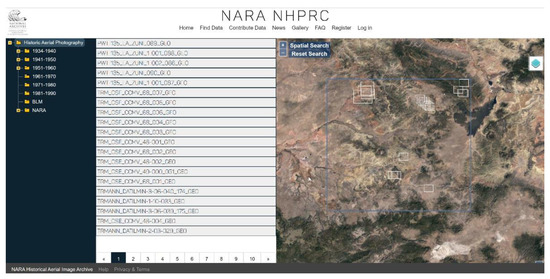 Additionally, the developed web application enabled spatial search (Figure 5), which can substantially improve the discoverability and use of historical aerial photo collections [21]. From the perspective of a data clearinghouse, an effective search operation should allow users to query data through not only textual search (e.g., keywords or location names) and catalog browsing (e.g., temporal search by catalog year) but also spatial search. In context of this research, spatial search is defined as custom query of historical aerial photos by drawing a rectangle search box. Historical aerial photos that are completely within the boundary of the rectangle search box will be returned for users to browse, select, and download. That said, historical aerial photos that are partially within or intersect the rectangle search will note be returned. This limitation is caused by the GDAL library that was used for developing the spatial search tool because it only supports completely within operation, not partially within or intersect operation.
