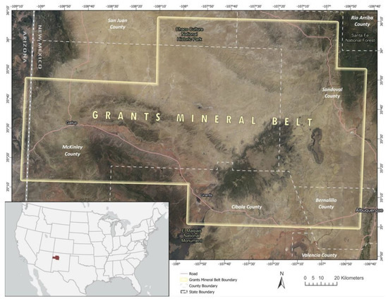 The location of Grants Mineral Belt. It is primarily located in the State of New Mexico but a tiny portion of the Grants Mineral Belt is located in the State of Arizona.