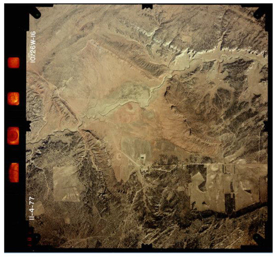 Two types of aerial films have been widely used for aerial photography, including panchromatic films and natural color films. Panchromatic films are also known as black and white films and the aerial photos acquired with this type of film are printed as hardcopy gray-scale photos with a size of 25.4 by 25.4 cm or 10 by 10-inch (Figure 7). Natural color films are also known as true color films and the aerial photos acquired with this type of film are printed as hardcopy true color images with a size as gray-scale photos (Figure 8). It should be noted that most historical aerial photos were acquired with panchromatic films, although some of them were collected by natural color films [1]. Since the early 1990s, aerial photos are commonly acquired with large-format digital cameras and the acquired photos are typically saved in a digital format that can be viewed and edited on computers to assist with modern image processing and analysis [1].