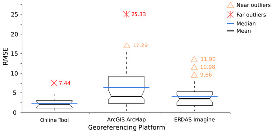 As a first analysis step, a box plot was created to assist with visual analysis and comparison among the three georeferencing platforms. Figure 9 shows the box plot and associated median, mean, max, min, the first quartile, the third quartile, and the outlier values. The x-axis indicates the three georeferencing platforms while the y-axis indicates the RMSE. The plot area indicates the distribution of the RMSE of each platform. As shown in Figure 9, both the median value and mean value of the RMSE set of the online tool were less than ArcGIS ArcMap’s and ERDAS Imagine’s values, indicating that the online tool can be used to produce georeferenced images that have higher accuracy. In other words, this observation reveals that the online tool outperforms ArcGIS ArcMap and ERDAS Imagine in terms of georeferencing. In addition, both the median value and mean value of the RMSE set of ERDAS Imagine were less than ArcGIS ArcMap’s values, implying that in general the ERDAS Imagine has better georeferencing performance or higher accuracy. Surprisingly, the geospatial industry widely adopted software ArcGIS ArcMap has the poorest performance in terms of georeferencing.