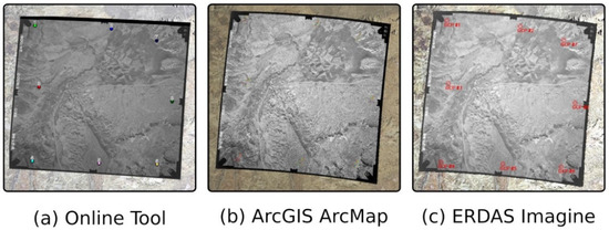 Eight GCPs were used to georeference each photo. Noting that this study was not focused on determining the optimal amount of GCPs for georeferencing historical aerial photos, and eight GCPs were used only to complete a second order polynomial transformation. To ensure accurate and fair comparison, the same eight GCPs were used across all three platforms when georeferencing a photo. This process was completed by first georeferencing a photo in ArcGIS ArcMap, and then the identical GCPs were identified and placed in ERDAS Imagine and the online georeferencing tool, respectively.