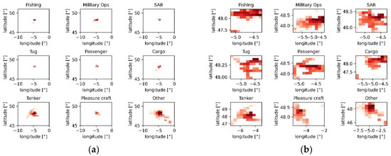 The sea area through which the target passes has context knowledge. The context information in different geographic locations is different. To distinguish the characteristic difference between different types of targets more effectively, we use context knowledge to enhance the trajectory information. Figure 2 shows the thermal maps of active areas for different types of ships. Figure 2a is the thermal map over the entire area. Figure 2b shows the details of the thermal map. The data used are described in Section 4. There are nine types of ships: fishing, military ops, SAR (search and rescue), tug, passenger, cargo, tanker, pleasure craft, and other ships. The red parts represent the area where the ships appear frequently, and the darker the color, the more frequently the target appears in the area. There are differences in the areas where ships of different types frequently appear, which can be used to help distinguish between different types of ships. Specifically, there are differences in the distance to the coast in areas where different types of ships frequently appear. In addition, the density of traffic varies in different areas. Three types of context information are extracted: maritime traffic density, distance of target to shore, and distance of target to ports. The following is an analysis of this contextual information.