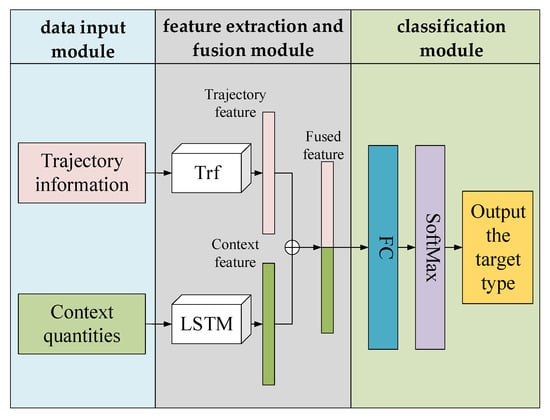 Figure 3 shows the structure of the neural network model. It includes three modules: a data input module, a feature extraction and fusion module, and a classification module. The trajectory information and context information depict the different attributes of the target. The main idea is to fuse the two kinds of information, obtain the fused information, and use the fused information to identify the target. Information fusion is a critical step. Trajectory information and context information are of different types; therefore, it is difficult to integrate them directly. The deep learning method provides a feature-level fusion method. One study [30] used two networks to extract the features of image information and text information, and the features were fused to obtain a fusion feature representation. Another study [31] first extracted the global feature and local feature of images and then fused them in the feature space. In our research, by using the feature extraction network, the trajectory information and context information are transformed into the feature space, and the feature vector is obtained. The feature vector is a unified representation. The feature vectors are used to realize the fusion of two kinds of information, which is the feature-level fusion. Specifically, the fusion feature is obtained by the concatenation operation in the feature space. By training the network model, in the feature space, the fusion features of different targets are far away from each other, and the fusion features of the same type of targets are close to each other to achieve the classification of targets. First, the data input module reads the formatted data. Second, the feature extraction and fusion module extracts the features of the trajectory information and the context information and fuses the extracted features to obtain the fused features. Finally, the fully connected layer and SoftMax layer complete the classification of the trajectory and output the category of the target. The format of the input data is M × L × D, where M represents the number of samples in one batch during the training process. L represents the length of a trajectory sample, which is the number of points in a trajectory. D is the dimension of each trajectory point. The transformer neural network was first proposed by Vaswani A. et al. in a study [32]. They used it to solve machine translation tasks and realize the processing of sequence data. The multihead attention algorithm was applied internally, which had advantages in extracting potential features. Multihead attention could effectively consider the important features of the trajectory, improving the attention to beneficial information and suppressing irrelevant information. Thus, the feature vectors extracted were more discriminative. Context information has a large dimension, and the rules of its change are easy to understand and mine. A LSTM [33] was used to extract feature information from context information. LSTM has a small number of structural parameters and easily converges.