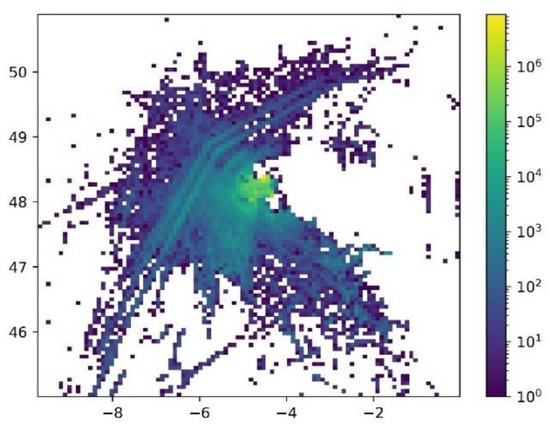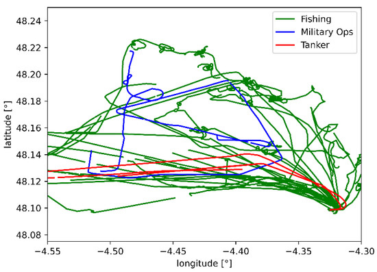 The AIS data used in this experiment are from the Celtic Sea and the Bay of Biscay (France) (see Figure 4). In Figure 4, the white part represents the sea, the blue part represents the land, and the points represent the trajectory points. The trajectories in the blue part are from rivers and lakes on land. Because this study only focuses on targets in the sea area, tracks in the inland area are excluded in the subsequent data cleaning and track sample generation. The right half of Figure 4 shows the enlarged partial detail and the trajectories of ship types. We take the construction of a context knowledge base in this sea area as an example to introduce the process of each context knowledge construction and the way of calculating context quantities through the knowledge base (The link to data and figure is https://zenodo.org/record/1167595/files/%5BP1%5D%20AIS%20Data.zip?download=1.) (accessed on 16 October 2021).