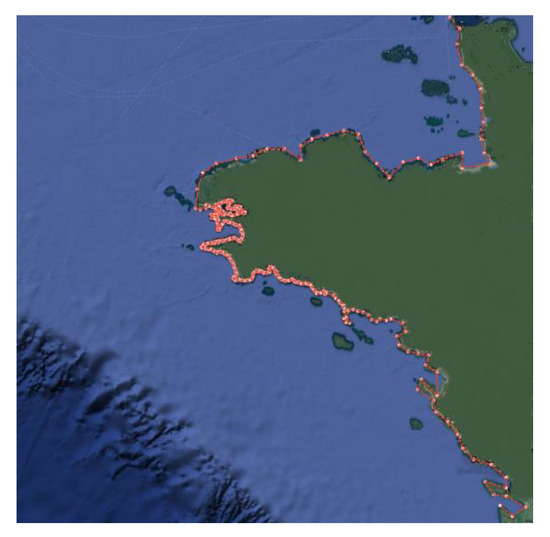 The real coastline is very tortuous and can be regarded as an irregular combination of convex polygons and concave polygons. It is difficult to calculate the precise distance from the target to the shore. The task does not need to obtain an accurate distance. The context knowledge only needs to reflect whether the target is near or far from shore. Accordingly, a general approximate distance calculation method is proposed in this paper, which can be used in building context knowledge bases in different regions. First, we mark points along the coastline at intervals. The interval of marker points depends on the distance between historical trajectory data and the coast. If they are generally far from the coast, the interval of marker points increases; otherwise, it decreases. After the whole coastline is marked, several marker points are obtained. Figure 6 shows the markers (white points) on the coastline. We calculate the distance between the target and each marker point. The minimum distance is the approximate distance between the target and the coastline. The work of marking is the knowledge base-building process. The process of calculating the approximate distance according to marker points is the process of obtaining .