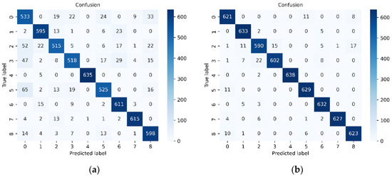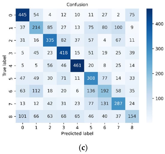 Confusion matrices of the results. (a) Confusion matrix without context enhancement. (b) Confusion matrix with context enhancement. (c) Confusion matrix under context information.