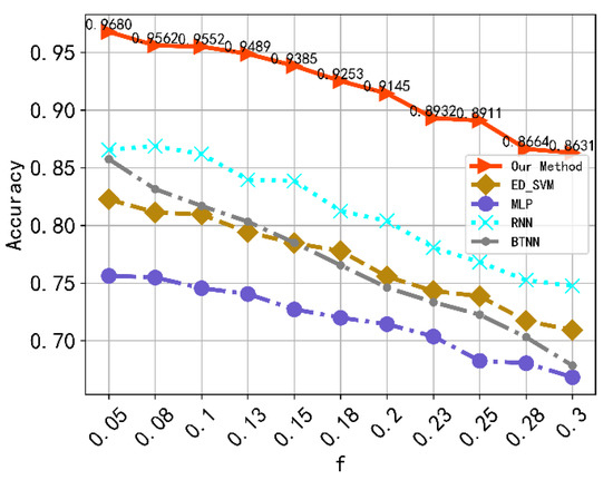 In the real world, noise is everywhere. The trajectory data collected by various sensors also have different levels of noise. To verify the recognition ability of the proposed method under different levels of noise, Gaussian noise is added to the input data in this experiment. More specifically, the noise data are added to the latitude (lat), longitude (lon), speed over ground (sog), course over ground (cog), and timestamp (t) in the trajectory data. The noise data are generated by setting the mean and standard of the matrix. The mean value of the Gaussian noise is 0, and the standard deviation is f [0.05, 0.08, 0.10, 0.13, 0.15, 0.18, 0.20, 0.23, 0.25, 0.28, 0.30]. Figure 9 shows the curves of the accuracy of the four methods changing with f. With the increase in f, the recognition accuracy of the four methods presents a declining trend. However, the recognition accuracy of our method is always higher than that of other methods under different noise levels. When f increases to 0.30, the recognition accuracy of our method is 0.8631, which maintains a high level. This shows that our method has a strong recognition ability in a noisy environment.