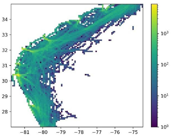 Grid map of maritime traffic density in the maritime area near the east coast of North America.