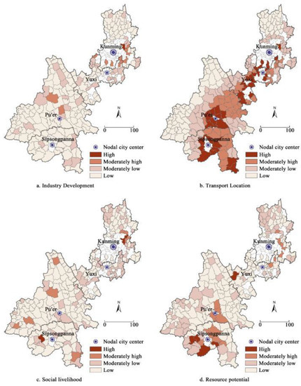In terms of different types, the small towns with high and moderately high scores in the industrial development dimension were mainly located around the urban area of Kunming. In the transportation location type, the farther away from the main transport routes, the lower the score of small towns, and almost all small towns at the high level were located around urban areas. In the resource potential type, small towns near urban areas in Kunming, Pu’er and Sipsongpanna showed strong development potential, while small towns far from urban areas were dominated by low potential. The small towns with high and moderately high scores for social and livelihood development were generally scattered, whereas the small towns with high and higher quality in the northeast side of Kunming showed a phase gathering trend, and also reflected a ‘core-edge’ characteristic.