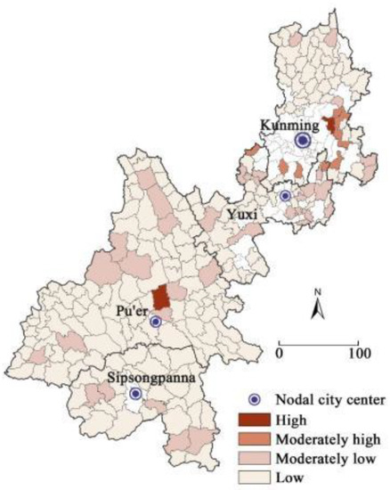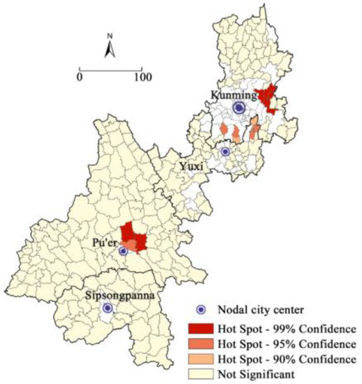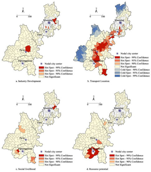 In terms of the social livelihood dimension, Figure 4c indicates four hot spot clusters. Among them, one cluster was adjacent to downtown Kunming, while three clusters contained three county seats: Weiyuan, Menghai, and Mengla, respectively. These agglomerations were close to cities of high administrative level or contained small towns with administrative functions, which had a good foundation for social development and were attractive in terms of investment and construction of infrastructure and public service facilities to serve the surrounding areas. Compared with other small towns, such clusters can provide residents with a wider variety of public services and have a higher population carrying capacity (Table 8).
