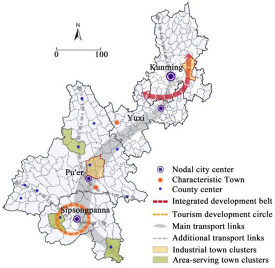 Based on the identification of spatial features and agglomeration characteristics mentioned above, we coordinated the organization of points, lines, axes, rings, groups, and other elements to build an integrated development belt around Kunming, a tourism agglomeration circle around Sipsongpanna, three service-oriented town clusters, two industry-oriented town clusters, multiple core nodes, and a ‘1 + 3’ transportation support network, which jointly constitute a spatial pattern of regional small towns (Figure 6).