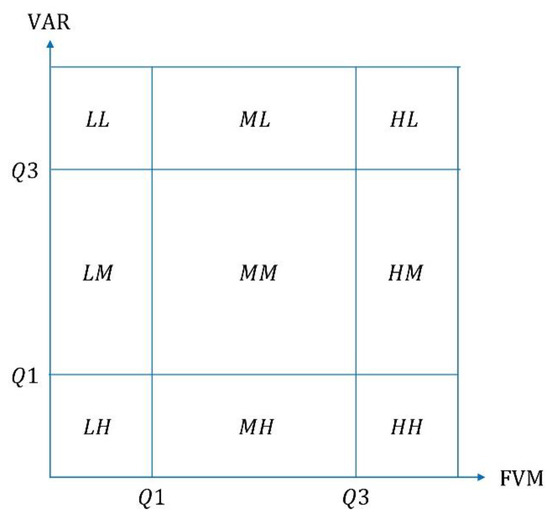 To better classify the type of OD pairs, we divide and stability according to the combination of flow volume and variability quartiles, respectively (Figure 2). The specific rules are shown in Equations (10) and (11), where Q1 and Q3 are functions for calculating the first and third quantiles. For example, HL in Figure 2 represents ODs with a relatively high flow volume and low stability, which means that the travel demand of this pair of ODs is large but varies greatly across days.