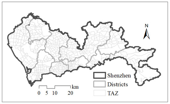 The raw taxi trajectory data include the operating trajectory data of approximately 17,000 taxis from 16 September to 28 October 2011. The data include device number, longitude, latitude, positioning time, and passenger load status (passenger load is 1, the empty load is 0), as shown in Table 1. We use the TAZs as geographic units to analyze the passenger travel OD. Shenzhen can be divided into 491 TAZs, with an average area of 3.98 (Figure 3).